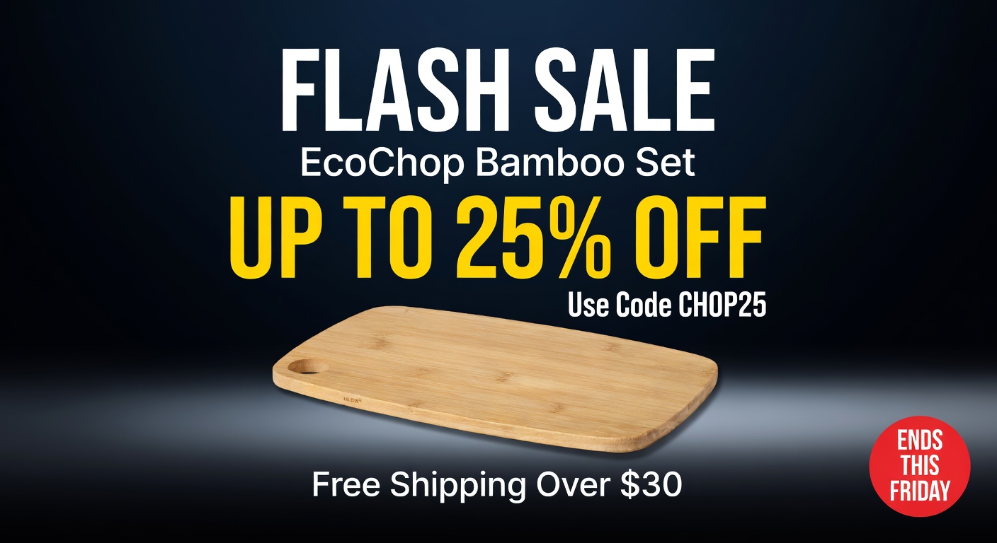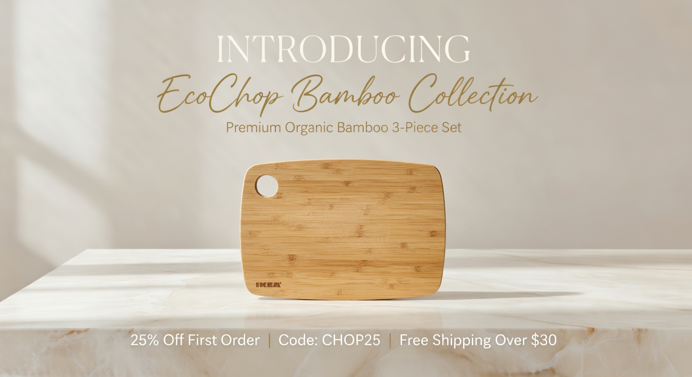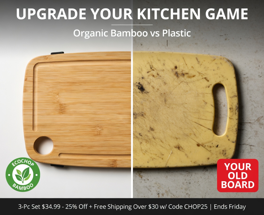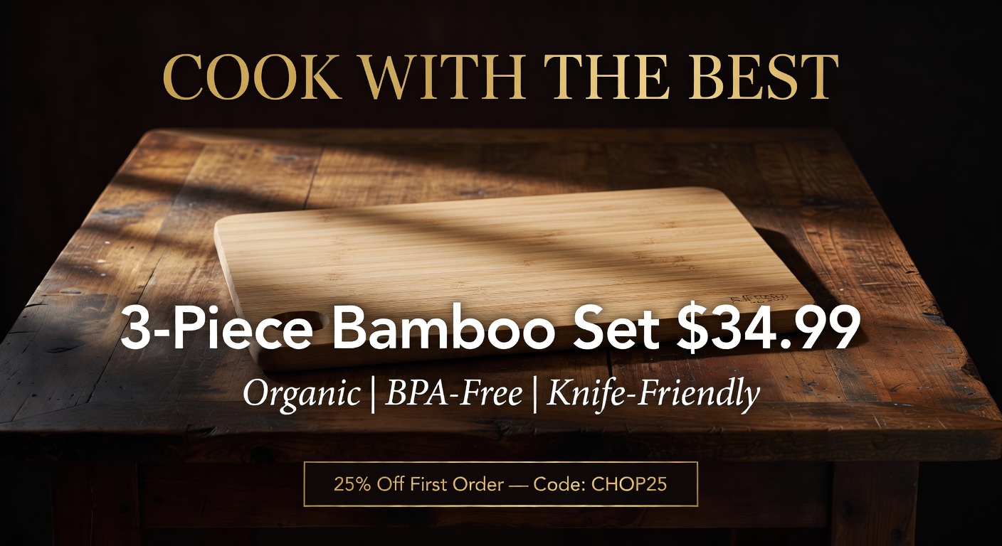 "Bamboo Cutting Board Set, 3-piece, organic moso bamboo, deep juice grooves, anti-slip feet, $34.99"